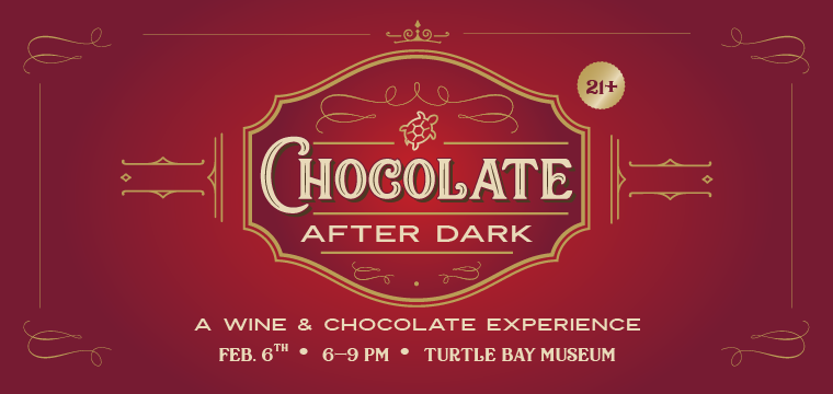 Chocolate After Dark is coming back to Turtle Bay on Friday, February 6, 2026 from 6pm - 9pm in the Turtle Bay Museum. Guests will enjoy an evening of unique chocolate delicacies, distinctive wine and beverage tastings from local vendors.